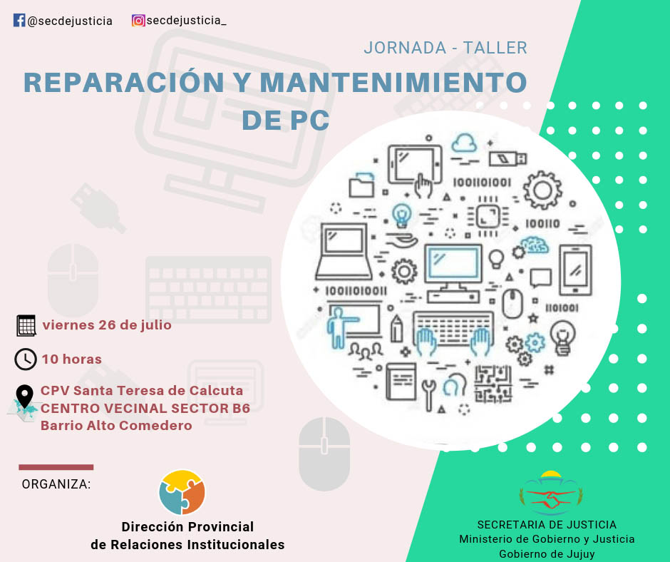 La Dirección de Relaciones Institucionales, de la Secretaría de Justicia, llevará adelante nuevamente la jornada taller “Mantenimiento y Reparación de PC”, entendiendo la importancia de los artefactos informáticos como elementos indispensables para efectividad la comunicación, en la educación, información y la globalización.