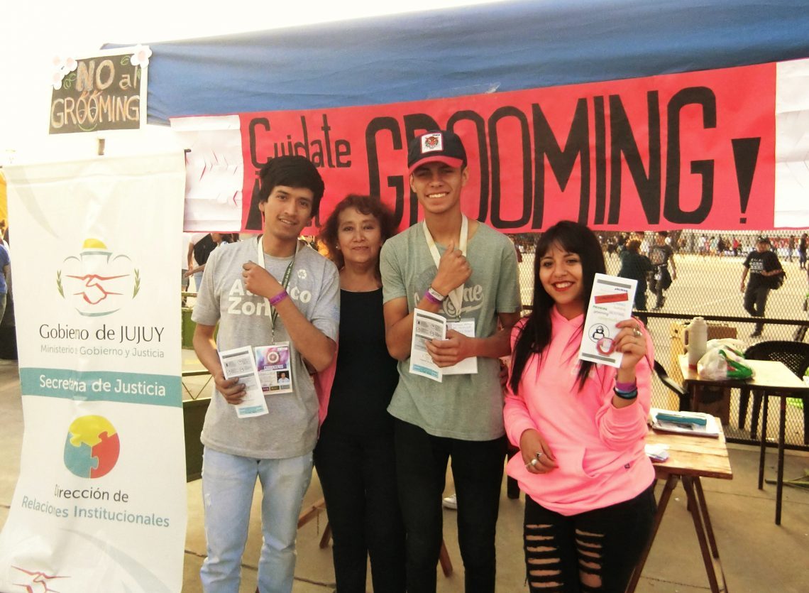 Con un stand informativo, la Dirección de Provincial de Relaciones Institucionales de la Secretaría de Justicia, repartió folletos explicativos, distintivos preventivos y pulseras bajo el lema “Cuídate del Grooming”, campaña que viene llevando a cabo en distintos establecimientos de la Provincia para la prevención en contra del Ciberdelito y el Grooming, en el marco de la Fiesta Nacional de los Estudiantes.