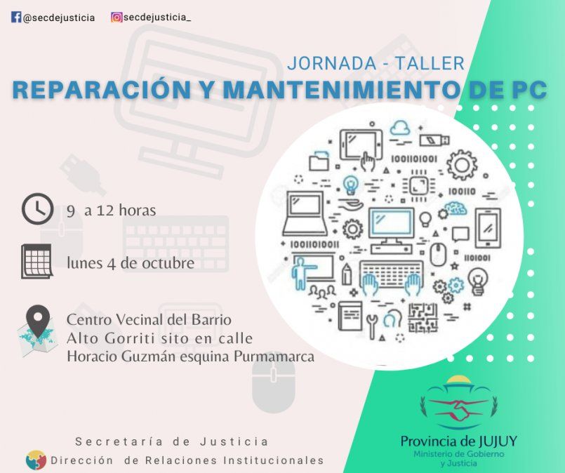 Con el propósito de impulsar una salida laboral, se realizará el taller “Mantenimiento y Reparación de PC”, organizado por la Secretaría de Justicia